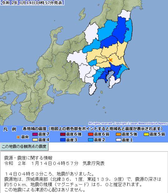 中新网1月14日电 据日媒报道,当地时间14日凌晨4时53分,日本茨城县南部发生里氏5级地震,震源深度为50千米,日本关东多地震感明显。