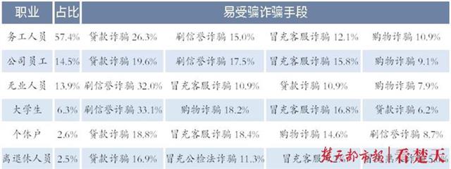 武汉市公安局反电信网络诈骗中心专门制作了受害人职业与受诈骗类型关联表格。