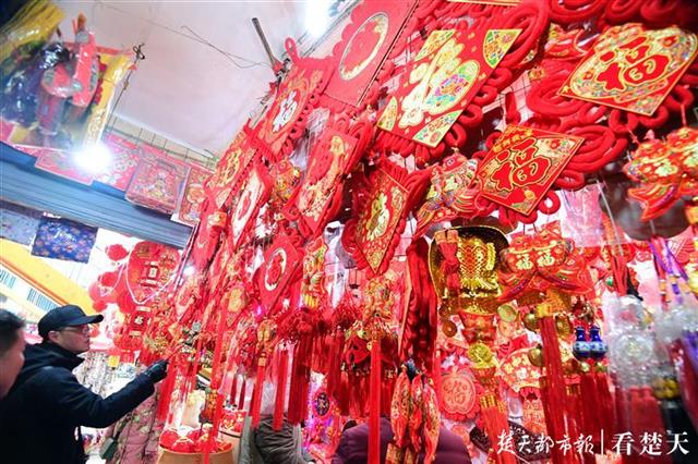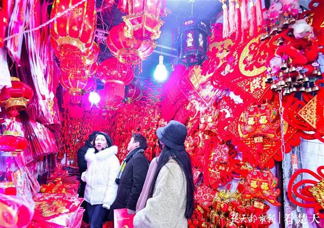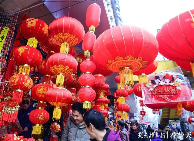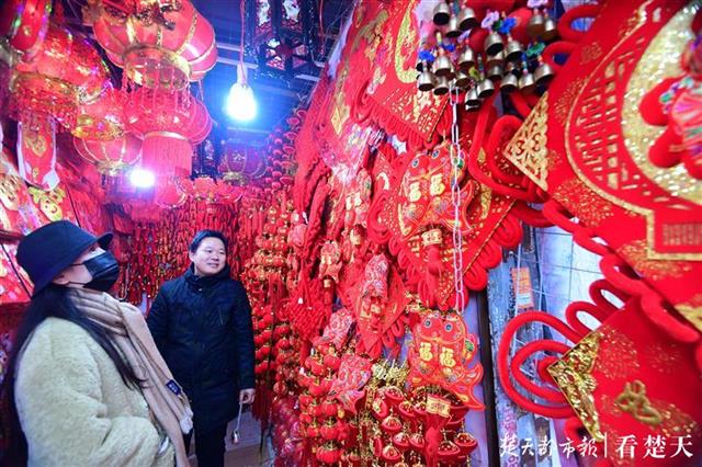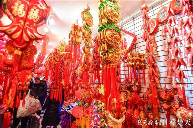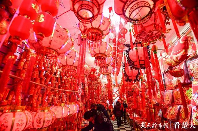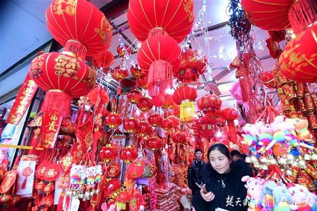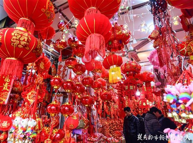 1月16日,在汉口集家嘴,汉正街市场大量的商铺挂出的红中国结、灯笼、电鞭炮,火红一遍,呈现红红火火的中国红,节日气氛浓烈。