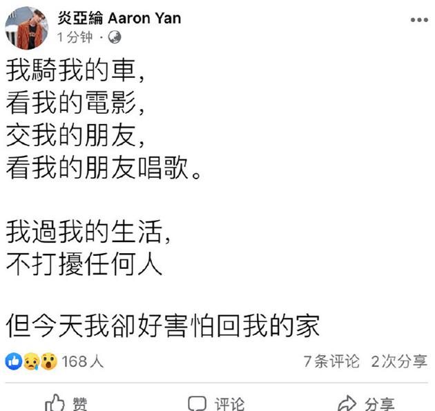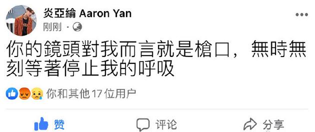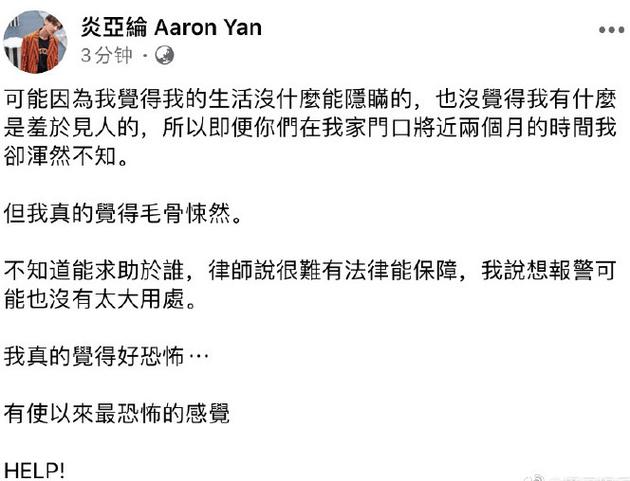 新浪娱乐讯 1月21日,炎亚纶就夜会阿本被偷拍一事进行回应,他在社交网站连发三条动态怼狗仔,更指出狗仔已经在他家蹲守将近两个月,而自己浑然不知,因此觉得“毛骨悚然”。炎亚纶发文:“我骑我的车,看我的电影,交我的朋友,看我的朋友唱歌。我过我的生活不打扰任何人”、“但今天我却好怕回我的家”、“你的镜头对我而言就是枪口,无时无刻等着停止我的呼吸”。