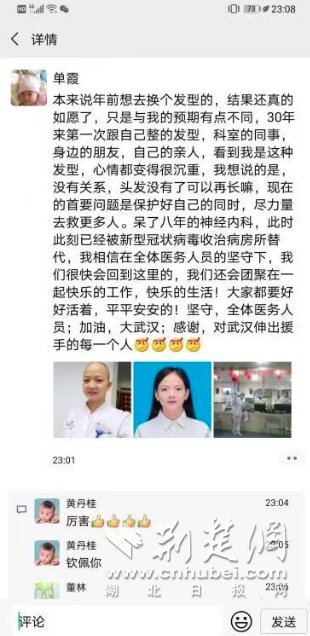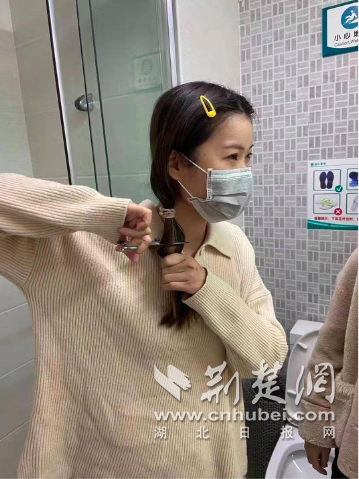 无独有偶,在武汉大学人民医院东院区神经内科,90后护士单霞也毅然剪掉了自己的长发,“头发没有了还可以再长,现在的首要问题是保护好自己的同时,全力以赴去救治更多的患者。”单霞坚定的说。