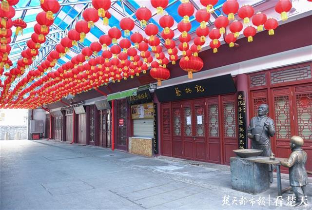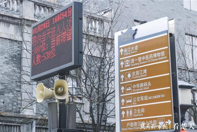 28日,武汉因防疫新型肺炎之需封闭离汉通道第六日。记者在武昌户部巷看到,平时每天游客数万人的小吃街,数百家小店铺都停了业,偶尔有一两个人从这里经过。下午5时许,巷内一块用于统计人流量的电子显示屏上显示:巷内当天进入人数880位,当前滞留人数538位(注:有一部分为居民和社区值班人员)。(楚天都市报记者 黄士峰 摄)