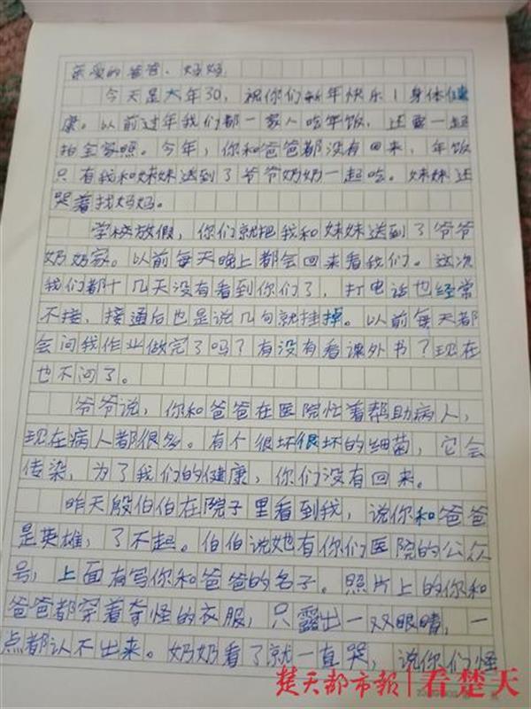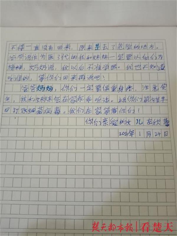 楚天都市报讯1月29日讯 (记者郭会桥) “以前你们每天晚上都会回来看我们。这次我们都十几天没有看到你们了,打电话也经常不接,接通后也是说几句就挂掉。以前每天都会问我作业做完了吗?有没有看课外书?现在也不问了。”楚天都市报记者今日获悉,武汉市江岸区光华路小学三(6)班左欣蕾写给父母的一封信在学校老师朋友圈里热传,让人泪目,也勉励人心。