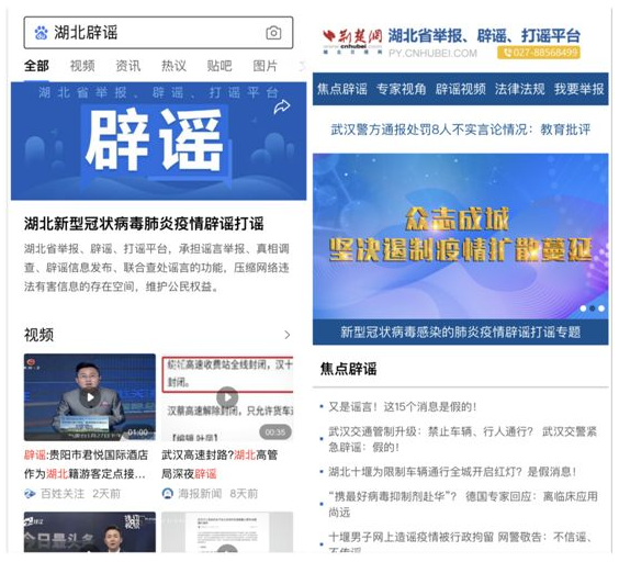 目前通过百度搜索“湖北举报、湖北辟谣、湖北谣言、湖北肺炎谣言”等关键词,均可直接进入到湖北省举报、辟谣、打谣平台移动端网页。