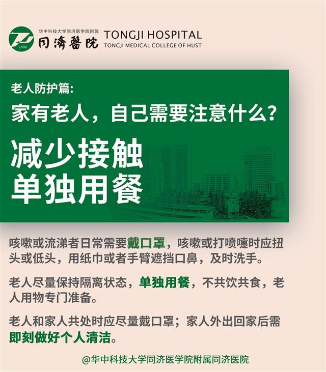 老人尽量保持隔离状态,单独用餐,不共饮共食,老人用物专门准备。