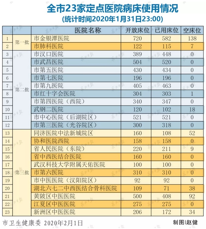 武汉市23家定点医院病床使用情况公布