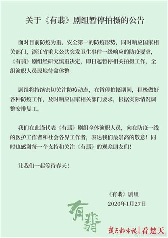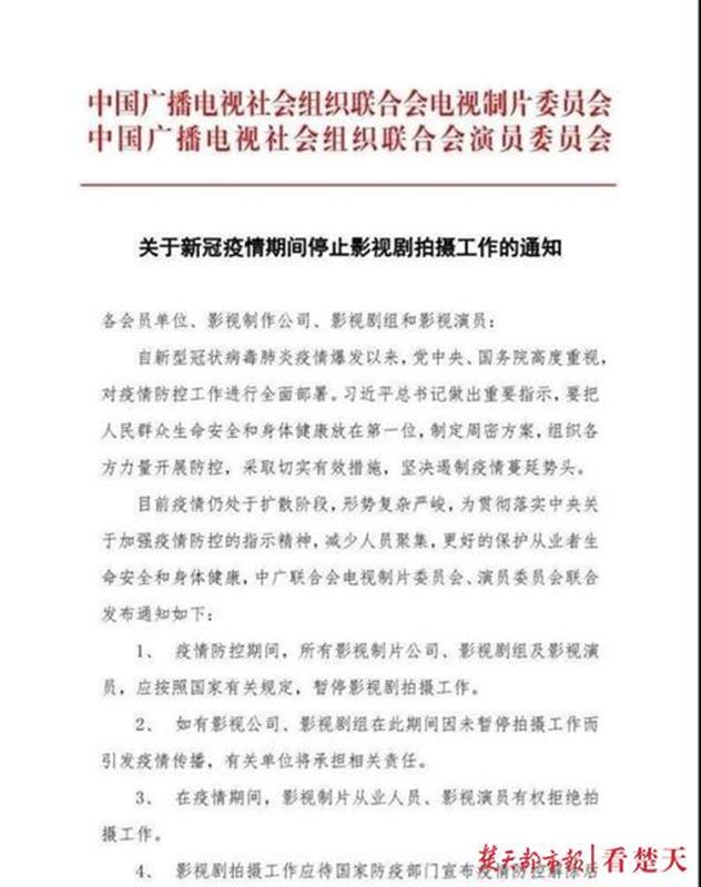 1日,中国广播电视社会组织联合会电视制片委员会、演员委员会联合发布《关于新冠疫情期间停止影视剧拍摄工作的通知》。《通知》中强调,目前疫情仍处于扩散阶段,形势严峻,为贯彻落实中央关于加强疫情防控的指示精神,减少人员聚集,更好的保护从业者生命安全和身体健康,要求: