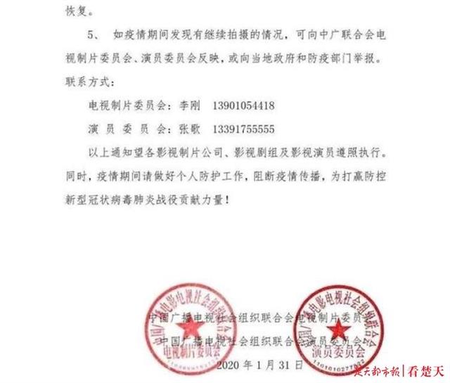 五、如疫情期间发现有继续拍摄的情况,可向中广联合会电视制片委员会、演员委员会反映,或向当地政府和防疫部门举报。