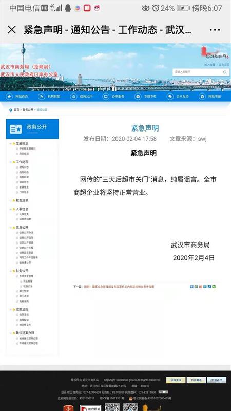 武汉市商务局也回应称,网传超市三天后关门为谣言,全市商超将坚持正常营业。