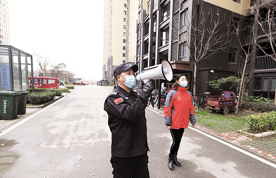 “防疫情、少出门、先报备、找社区……” ,武汉东湖高新技术开发区智苑社区工作人员不间断地用“小喇叭”开展防控宣传。 (湖北日报全媒记者 张鸿 摄)