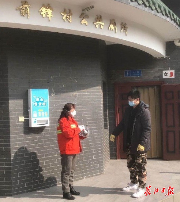 胡康胜在公厕检查消毒杀菌 通讯员黄亮 提供