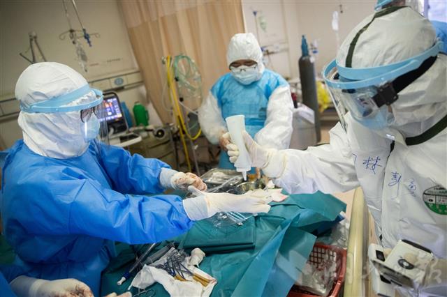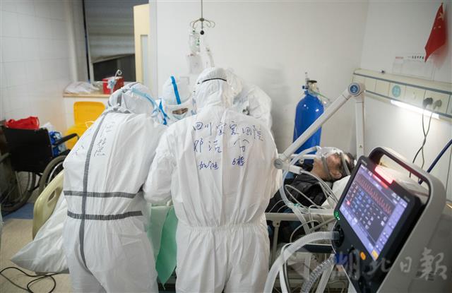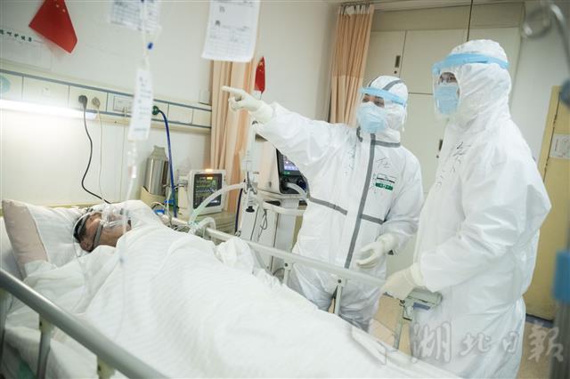 2月9日,武汉市红十字会医院ICU病房,四川医疗队和红十字会医院的医生正在共同协作运用ECMO技术共同抢救重症患者。(湖北日报全媒记者 柯皓 通讯员 邱琼 姚祖东 摄)