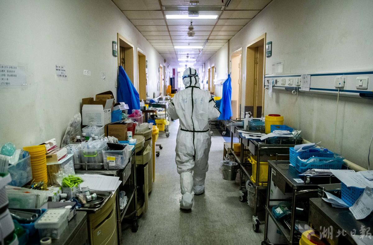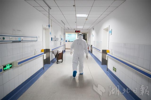 2月9日,武汉市红十字会医院隔离病区,俞巍医生从走廊经过。他已经连续工作6小时。(湖北日报全媒记者 柯皓 通讯员 邱琼 姚祖东 摄)