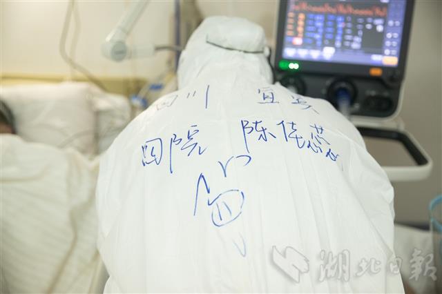 2月9日,武汉市红十字会医院ICU病房,四川医疗队护士陈佳蕊的防护服上写着名字、画着笑脸。(湖北日报全媒记者 柯皓 通讯员 邱琼 姚祖东 摄)