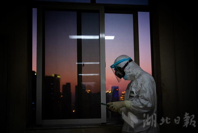 2月9日傍晚,武汉市红十字会医院隔离病区,准备换班的江承欢医生靠在走廊窗边查看信息。(湖北日报全媒记者 柯皓 通讯员 邱琼 姚祖东 摄)