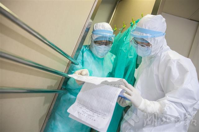 2月9日,武汉市红十字会医院隔离病区,华西医院护士何国庆(左)和武汉红十字会医院护士张婷一起核对患者药品信息。(湖北日报全媒记者 柯皓 通讯员 邱琼 姚祖东 摄)