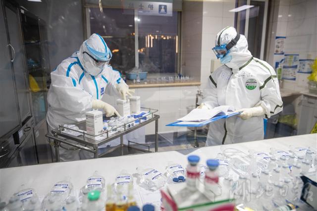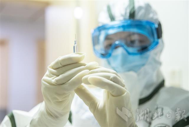 2月9日,武汉市红十字会医院隔离病房,来自华西医院的护士何国庆准备为患者注射药品。(湖北日报全媒记者 柯皓 通讯员 邱琼 姚祖东 摄)