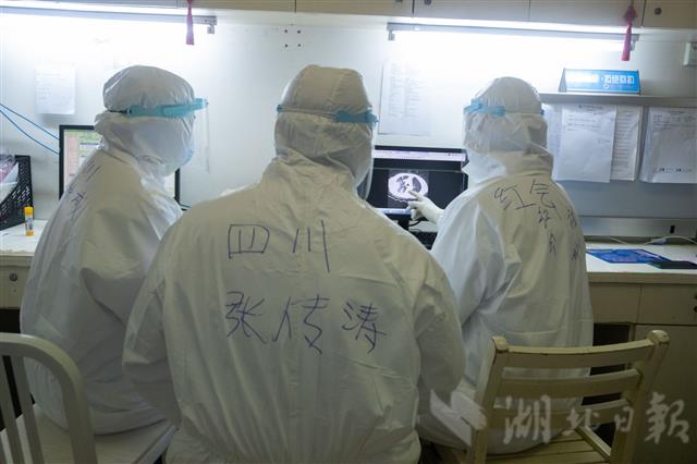 2月9日,武汉市红十字会医院隔离病区办公室,四川医疗队医生张传涛(中)和红十字会医院的医生交流探讨患者病情。(湖北日报全媒记者 柯皓 通讯员 邱琼 姚祖东 摄)