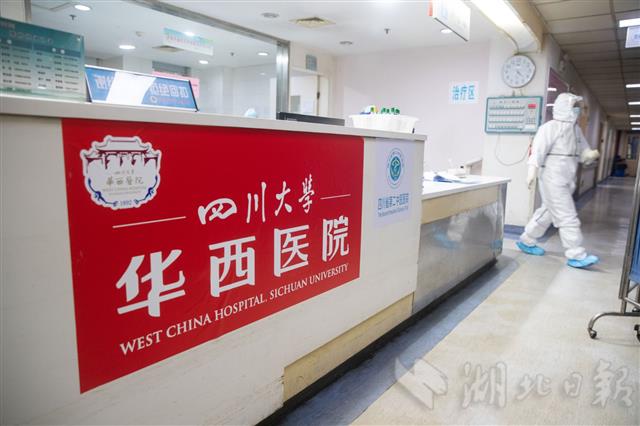 2月9日,武汉市红十字会医院隔离病区,华西医院的旗帜贴在了护士台上。(湖北日报全媒记者 柯皓 通讯员 邱琼 姚祖东 摄)