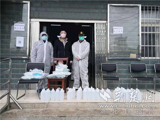 由于防护物资紧缺,陈良钧、容伟向爱心企业“四处化缘”, 收到了湖北融强建筑有限公司董事长廖建华先生捐赠医用酒精125斤,医用护目镜100个,胜强农贸市场负责人邓同胜捐赠的酒精100斤,解了隔离点消毒防护的燃眉之急。