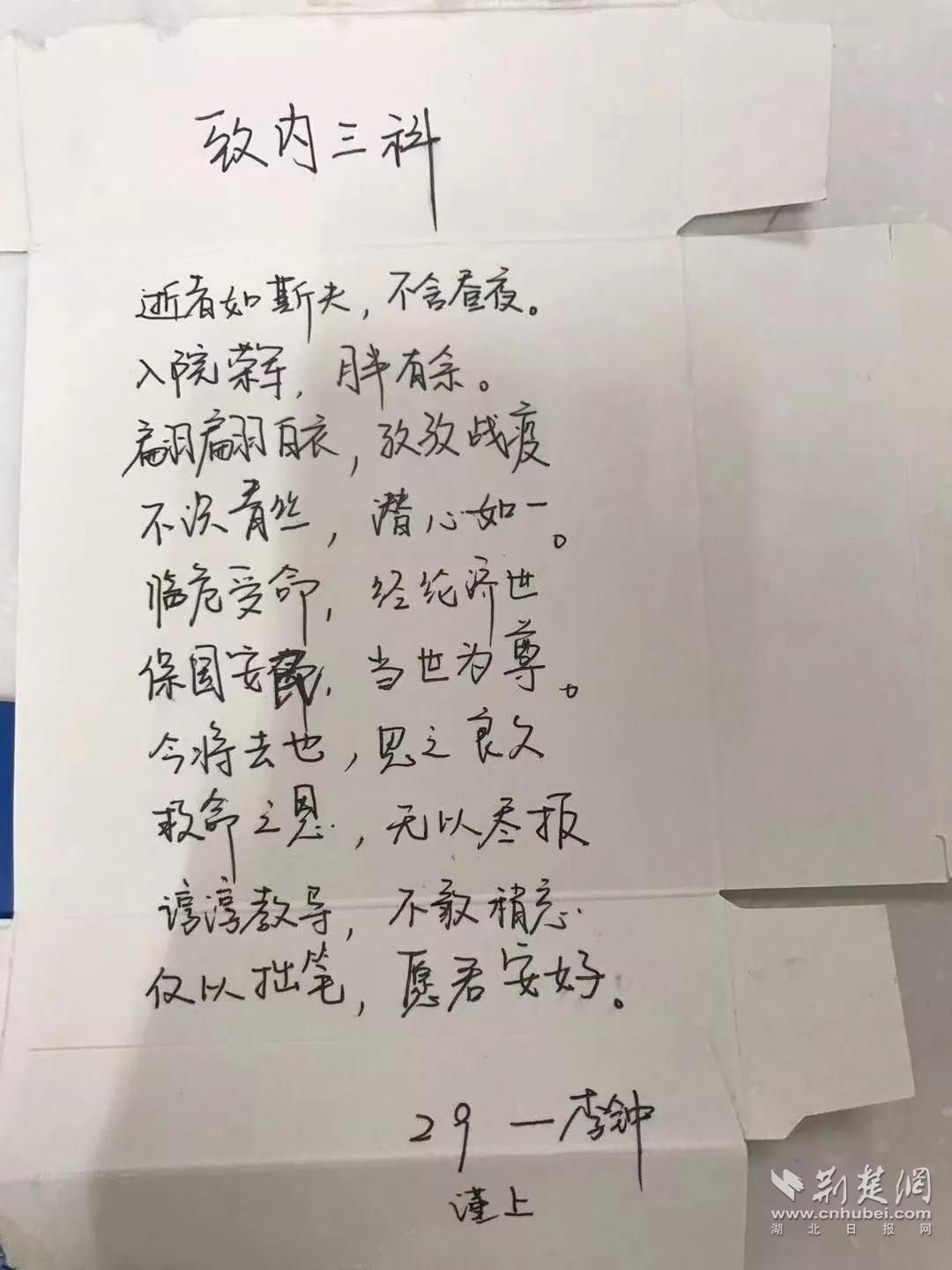 荆楚网客户端—荆楚网消息(通讯员 孙四海)“救命之恩,无以尽报;仅以拙笔,愿君安好。”2月13日下午,湖北省荣军医院内三科收到一封特殊的“感谢信”,这是一名新冠肺炎患者治愈出院前在药盒背面写下的感激之言。