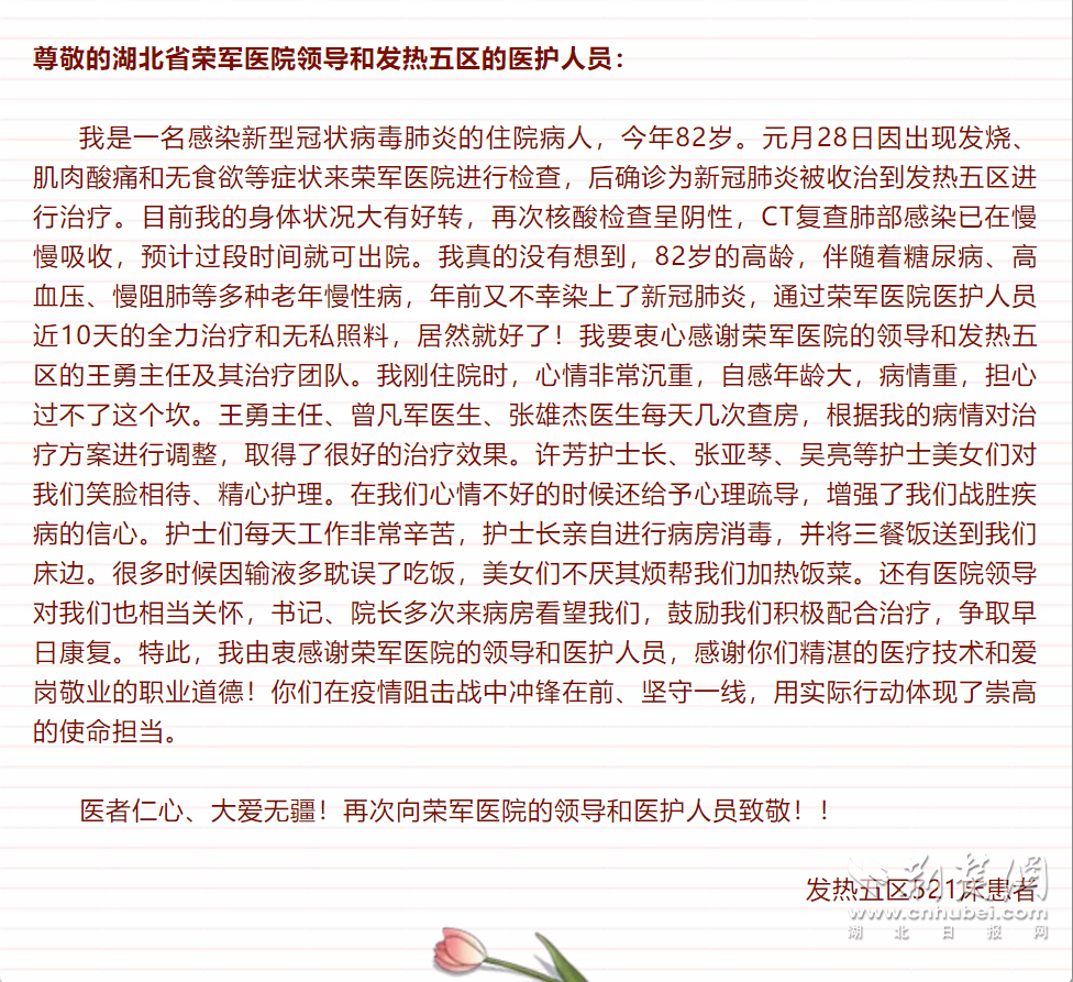 “我真的没有想到,82岁的年岁染上新冠肺炎,通过荣军医院医护人员近10天的全力治疗和无私照料,居然很快就好了!” 由张奶奶口述、亲属整理的感谢信,也是省荣军医院收到的众多感谢信之一。