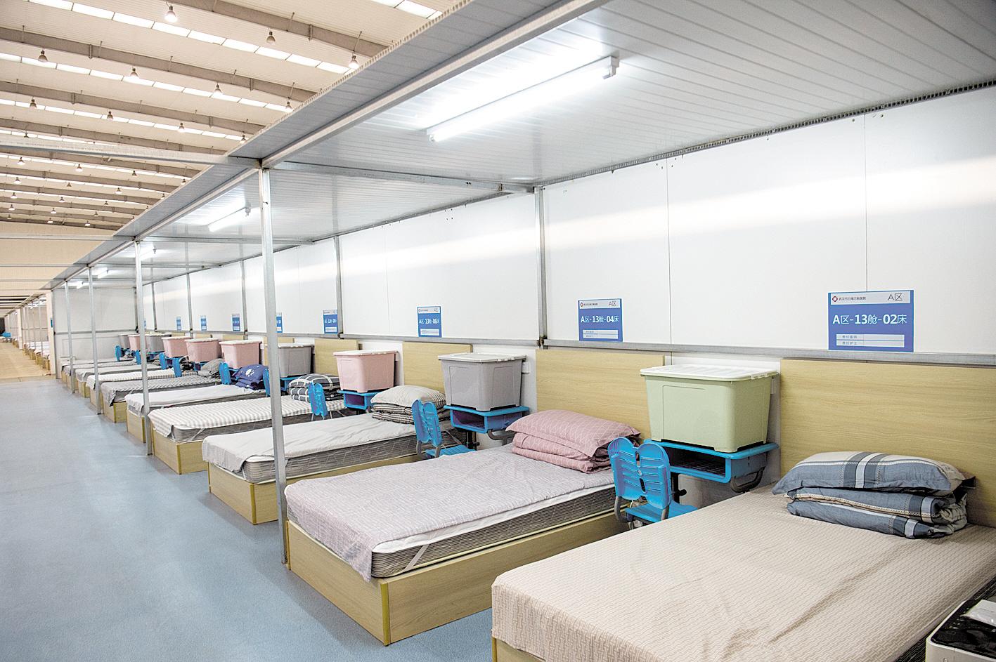 2月17日,鸟瞰武汉市江夏区日海方舱医院建设现场。目前,工人们正在原址的厂房内搭建隔板,改造接近尾声。其中一栋厂房内,1400张床位已布置完成,病床上设有顶棚,席梦思、床头柜、电热毯、空气净化器等生活设施一应俱全。据悉,该方舱医院设计床位4500个,规模为武汉市目前最大。