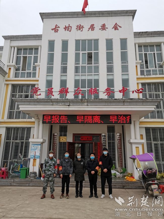 武汉职业技术学院学生叶壮志(左二)与古均街居委会党员干部并肩作战。通讯员供图