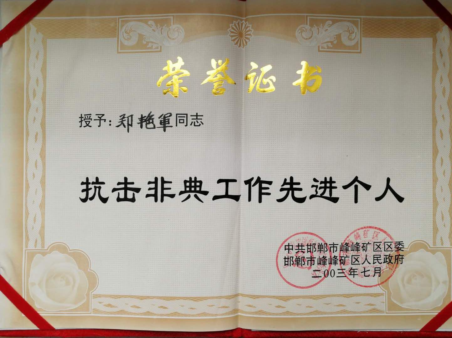 郑子奇父亲在2003年参加抗击非典工作时荣获的先进个人荣誉证书