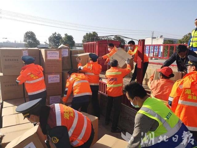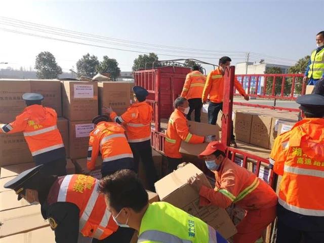 9:00,两辆转运车赶到现场,现场人员立即搬运物资。10:17,所有物资全部搬运完毕,2辆路政车护送防疫物资车飞速前往武汉。