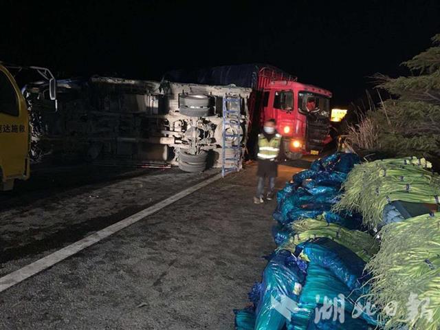 当日1:08,麻武高速信息监控中心接到事故报警,麻武向K689+650处(麻城境内)发生3车追尾事故,其中有一辆车发生侧翻,造成现场拥堵,车辆无法正常通行。黄黄高速管理处养护部门工作人员迅速赶到现场,发现有2辆车上挂着“武汉加油”等字样,其中一辆运输的是蔬菜,另一辆运输的是护目镜,侧翻的是护目镜车辆,大量纸箱散落在路上。现场无人员伤亡。