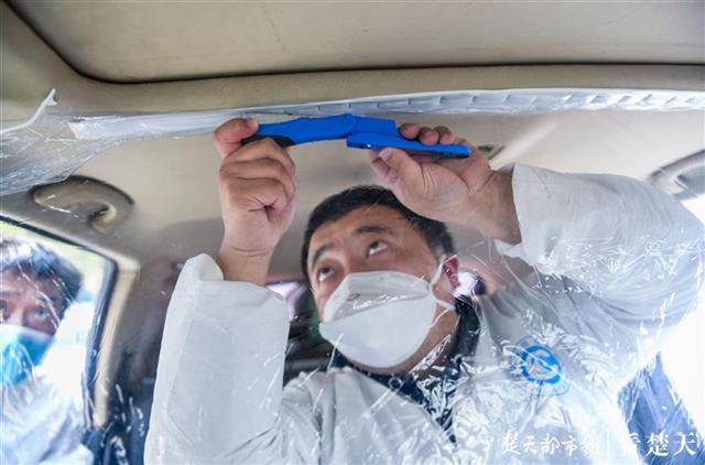 楚天都市报2月25日讯(记者陆缘 黄士峰)身穿防护服,拿着双面胶从贴完膜的一辆警车后排座出来,满头大汗的滴滴志愿者张国维顾不上擦汗,和同事又摊开一张塑料薄膜,随即再钻进另一辆警车。