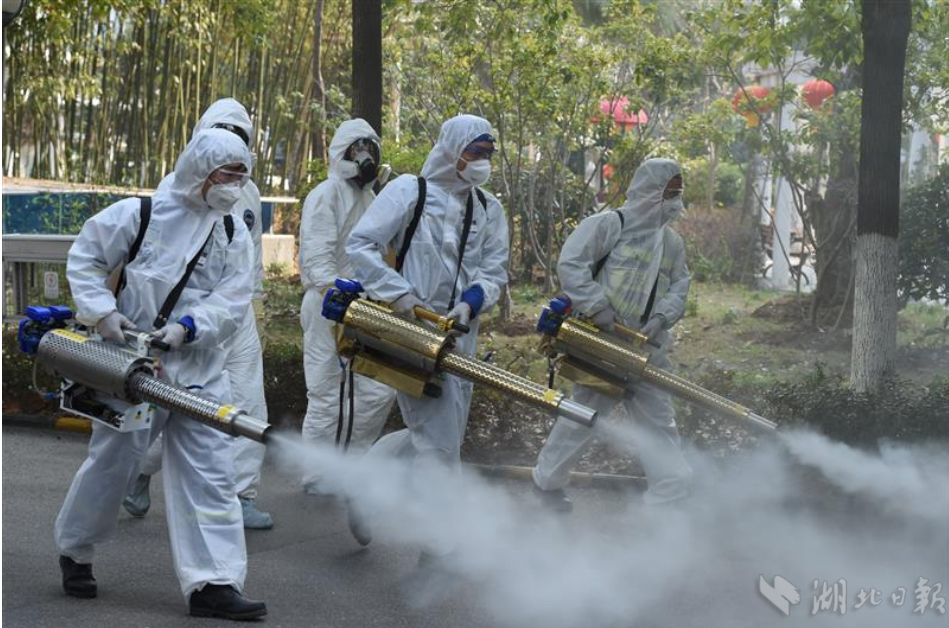 2月23日下午,34名蓝天救援队队员对武汉市武昌区徐东路社区楚天丽园小区进行全面消杀。(湖北日报全媒记者 周立新 摄)