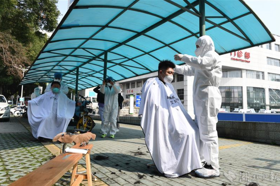 2月23日,椰岛公司发型师正在给武汉市中南医院急诊科近百名医务人员义务免费剪发。(湖北日报全媒记者 周立新 摄)