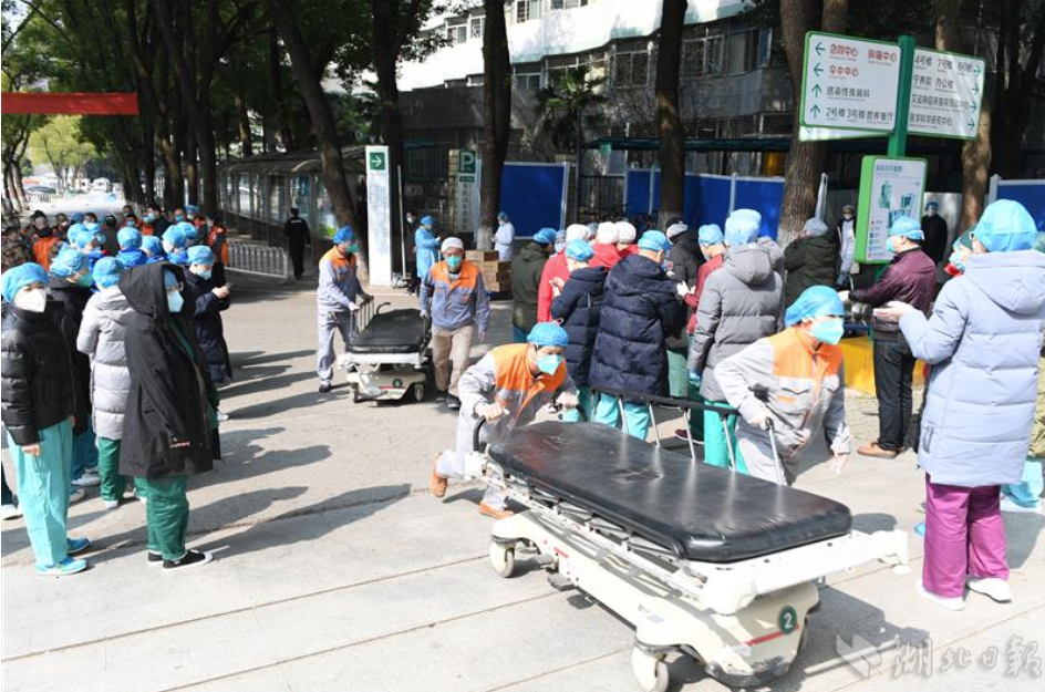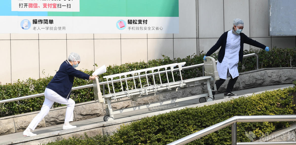 2月23日,在武汉大学中南医院内,两名护士在努力转移病床。(湖北日报全媒记者 周立新 摄)