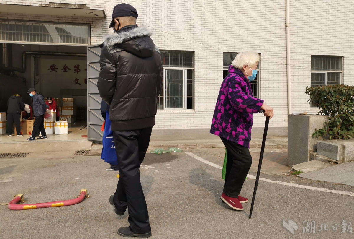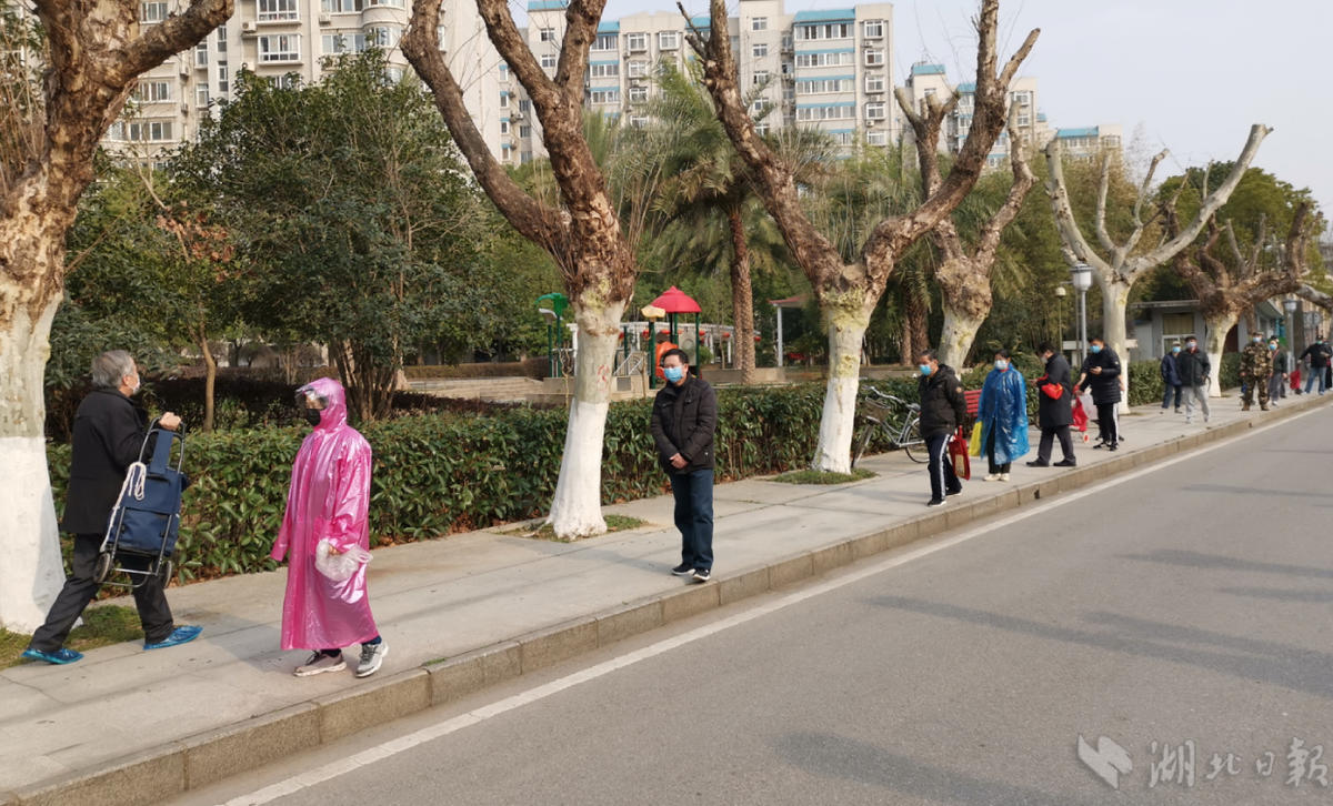 2月24日,武汉市一小区,居民在排队取菜。(湖北日报全媒记者 周立新 摄)