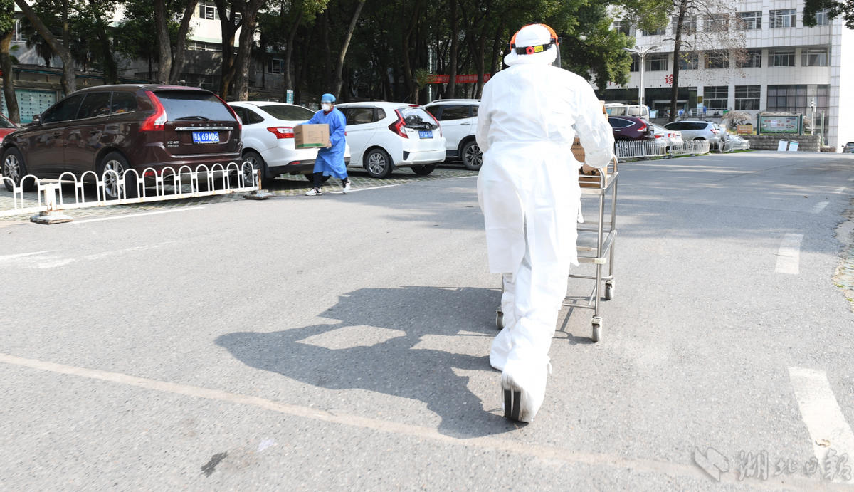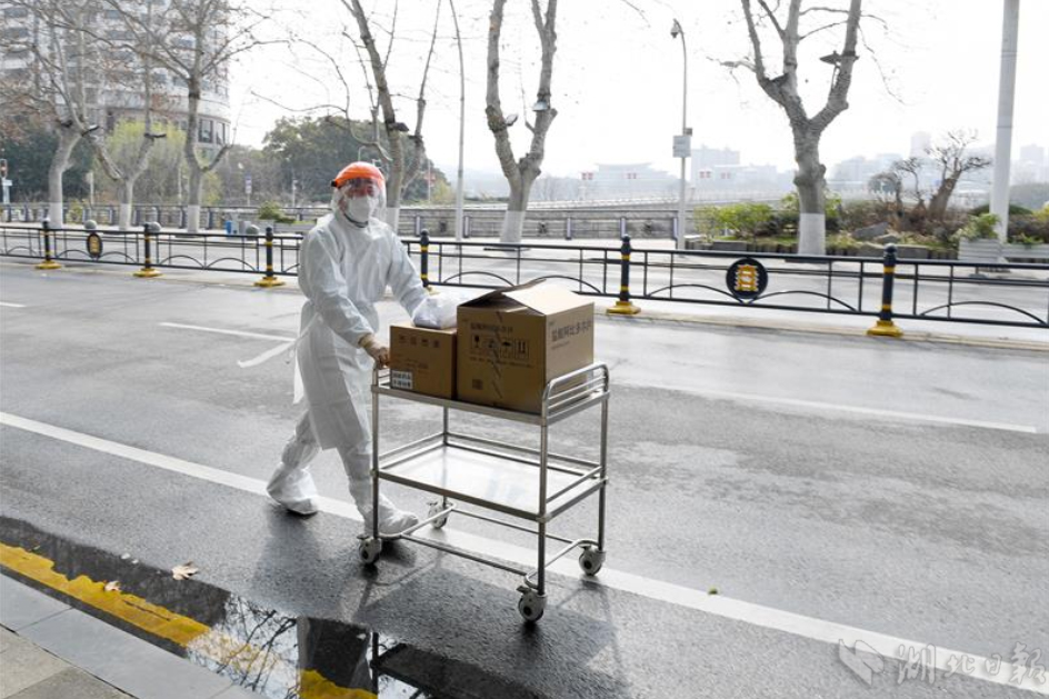 2月23日,在武汉大学中南医院门外公路上,一名药剂师在推着药品送往医院发热门诊病区。(湖北日报全媒记者 周立新 摄)