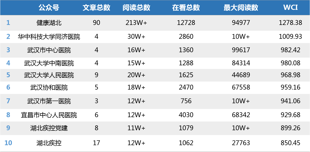 本期,医疗行业微信榜单前十中,医院微信公号共有7个,医疗机构微信公号仅有3个。从地域分布看,主要涉及省直、武汉、宜昌。整体上,阅读总数、在看总数、WCI指数较上期均有所下降,取得单篇最大阅读数10W+的微信公号仅有3家。其中,“健康湖北”的所发文章总数高达90篇,助力其阅读总数和在看总数稳居榜单第一,意料之中夺得榜单冠军。“华中科技大学同济医院”阅读总数较上期有所增加,并创造了单篇文章最大阅读数10W+的好成绩,助其排名上升,夺得榜单第二。“武汉市中心医院”各项指数数值较为均衡,单篇文章的最大阅读数99617,位列该项指数榜单第二,总体排名位列第三。值得一提的是,“武汉大学中南医院”从上期的排名第九,本期跃升至第四,有较大潜力。