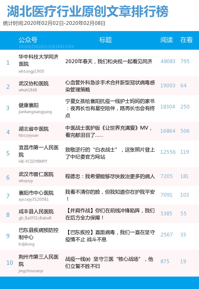 2月27日,由荆楚网(湖北日报网)、楚天舆情数据研究院制作的湖北医疗行业微信排行榜第10期发布。相较上期,“健康湖北”依旧是本周榜单冠军;“华中科技大学同济医院”排名上升1位,取得榜单第二名;“武汉市中心医院”排名上升2位,位列第三。