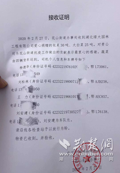 “在网上看到花山街是武汉比较严重的疫区,目前蔬菜比较紧缺时,我就想尽自己的能力为抗击疫情做点事。”湖北绿大园林工程有限公司董事长熊运华如是说。他到处联系,通过朋友在蔬菜生产大县嘉鱼县潘家湾蔬菜基地联系购买到蔬菜捐赠给花山街。熊运华还对笔者说,这样不仅解决了疫区市民吃菜难的问题,同时又帮助菜农解决了蔬菜滞销的问题。