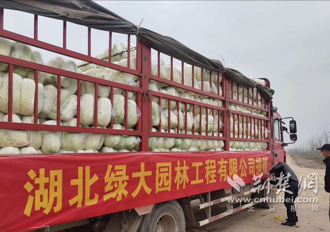 荆楚网客户端—荆楚网消息(通讯员胡建斌)2月27日下午,四车满载55吨大白菜、甘蓝的大卡车,从咸宁市嘉鱼县潘家湾驶出,运往武汉市东湖高新开发区花山街。该批蔬菜是由湖北绿大园林工程有限公司捐赠给武汉的爱心菜。