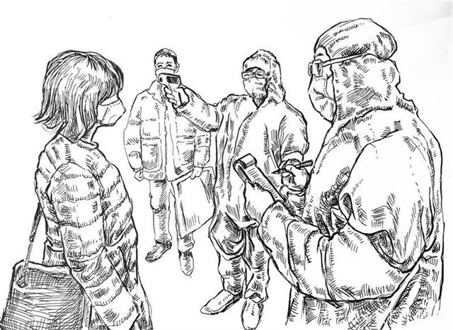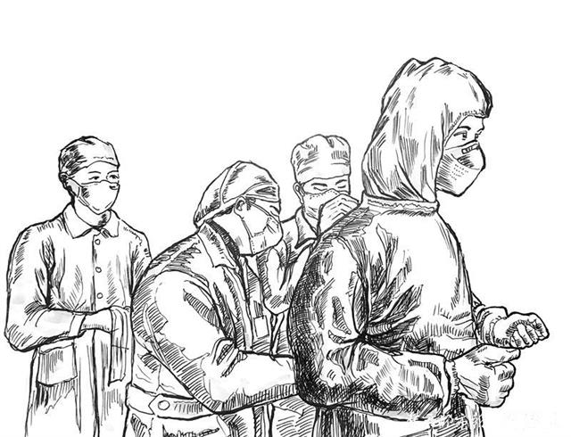 30幅系列钢笔素描中,描绘对象有医护人员、解放军指战员,医院建设者,还有社区工作人员、志愿者、快递小哥、摄影记者等等。“画中的人物都戴有口罩,这在我以前的习画经历中,是从未有过的,这也决定了这批钢笔素描具有特殊性和纪念性。”他说。