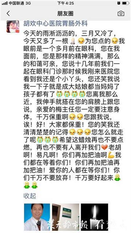 该院不少医护人员的朋友圈里,是连续的两只蜡烛。3月1日,大家送走甲乳外科主任江学庆,仅隔了一天,3日又送走眼科副主任梅仲明。