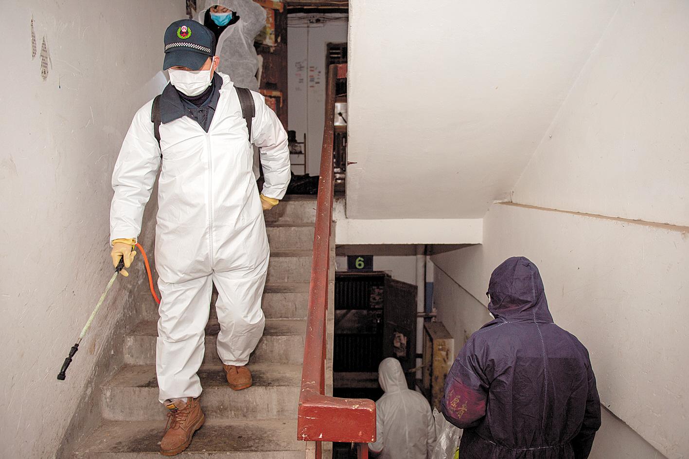 江岸区吉庆社区,工作人员对楼道仔细消杀。
