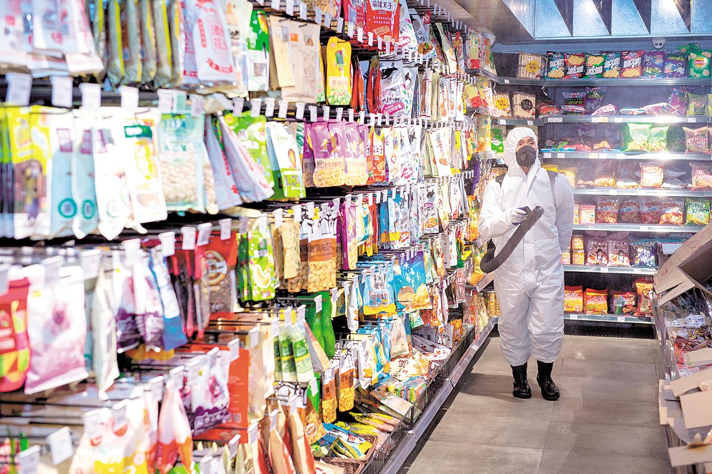 江岸区吉庆民俗街中百仓储店内,工作人员在作消杀处理。