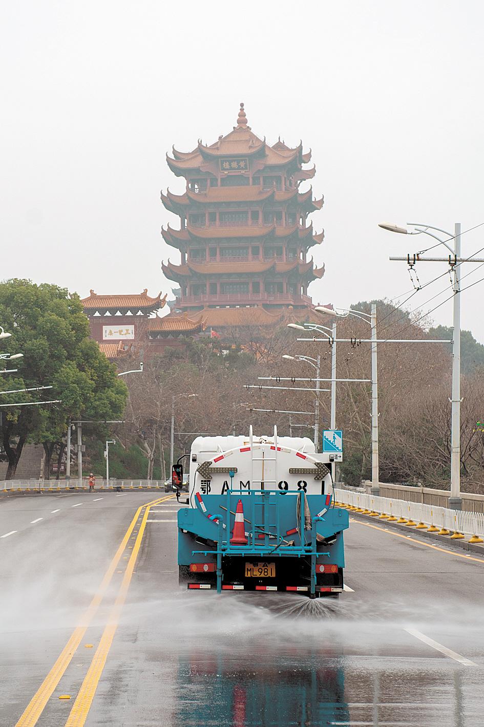 武昌区武珞路,一台环卫车正对路面进行清洗和消毒。