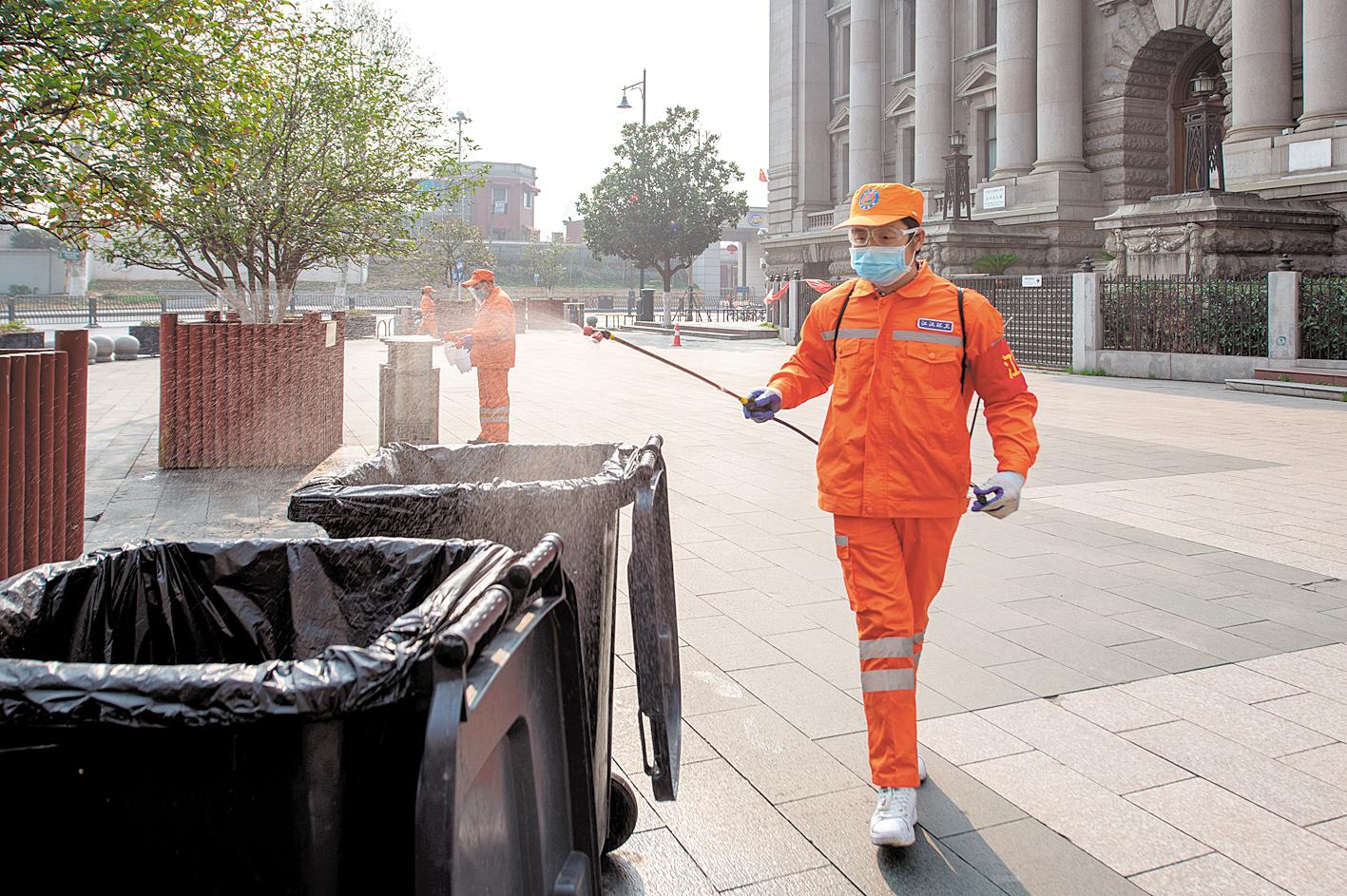 江汉关博物馆钟楼前,环卫工人对垃圾桶喷药消毒。