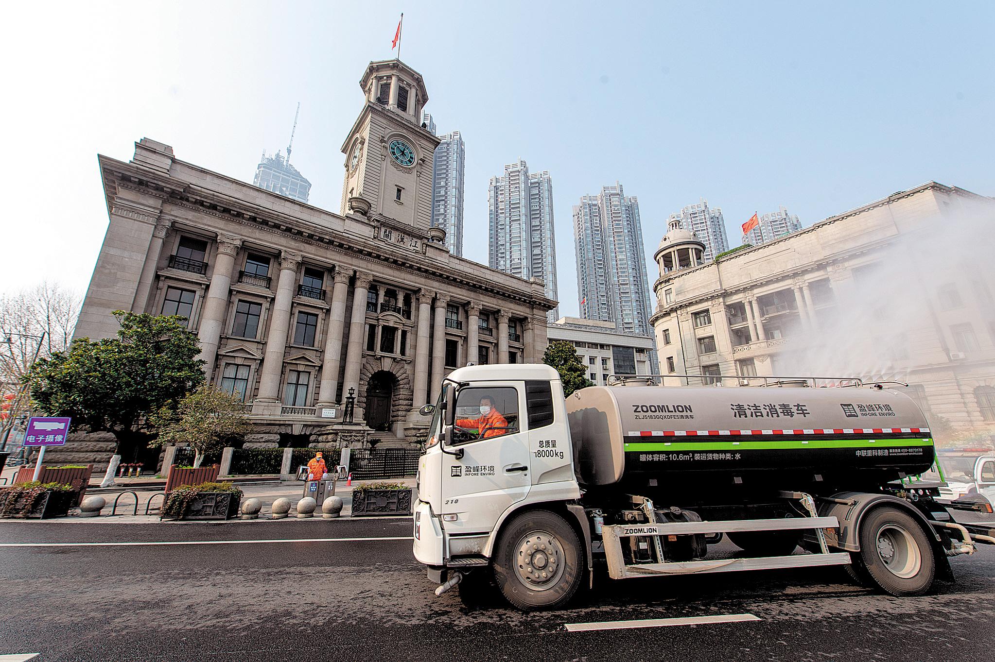 2月25日,清洁消毒车辆在沿江大道忙碌。