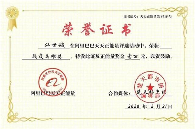 2月21日,楚天都市报携手阿里巴巴天天正能量授予江世娥“抗疫英雄”奖,并奖励一万元。阿里巴巴天天正能量在给江世娥的颁奖词中写道:“年轻的她,是母亲,是妻子,也是无数抗疫医护人员中,普普通通的一员。这段蹲在路边吃饭的短暂时光,是她和家人20多天里的第一次相聚。一张照片,满屏心酸。在这场没有硝烟的战“疫”里,每一个战士都是凡人,每一个凡人背后,都是一整个家庭。他们挺身而出,并非无牵无挂、无惧无畏,只是关键时刻选择了担当。”