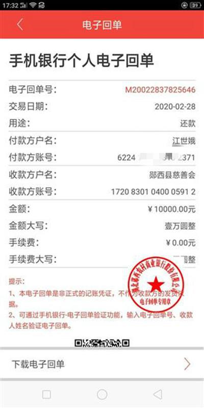 2月28日,江世娥通过手机转账将一万元奖金捐给郧西县慈善总会,将刚刚得到的奖金全部捐出。根据他的意愿,她希望把这笔钱用在店子镇的防疫工作上。